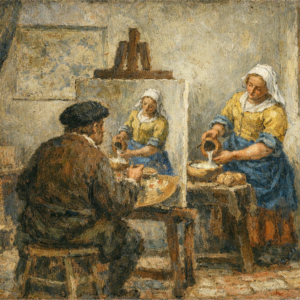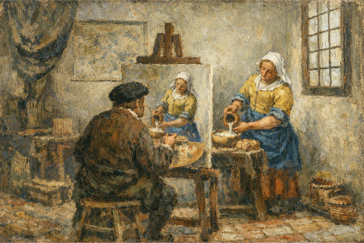 「牛乳を注ぐ女(フェルメール)をお手本にしている人物」の図である。